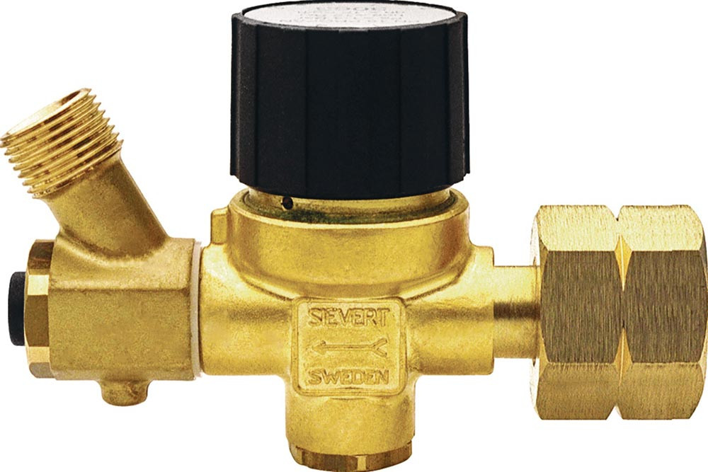 mit drehbarer Schlauchbruchsicherung und stufenlos, von 1 - 4 bar einstellbarem, Arbeitsdruck · er eignet sich somit für Löt- als auch Aufschweißbrenner