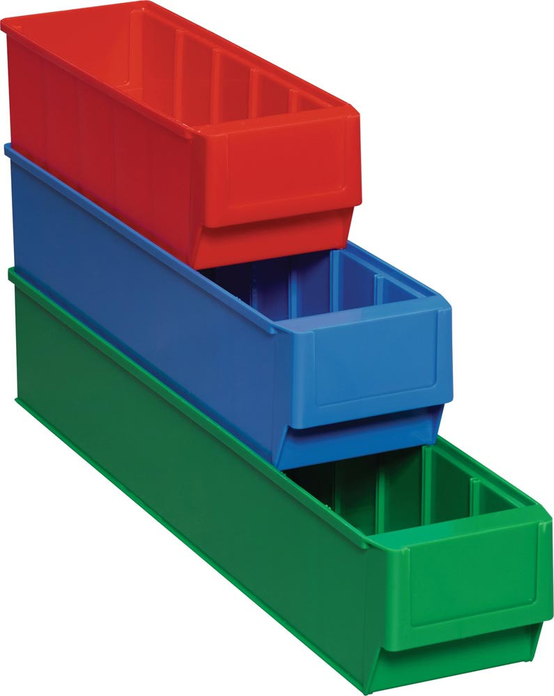 aus hochwertigem Polypropylen · rot · weitgehend beständig gegen die meisten Säuren und Öle · temperaturbeständig von -20 °C bis +80 °C · gewellter Innenboden für die leichte Entnahme von Kleinteilen · robuste Griffmulde mit großer Fläche für Beschriftungsetiketten (s. Zubehör) · variabel einsetzbar durch umsteckbare Trennwände (s. Zubehör) · die optionale Auszugssperre verhindert das Herausrutschen der Box aus dem Regal