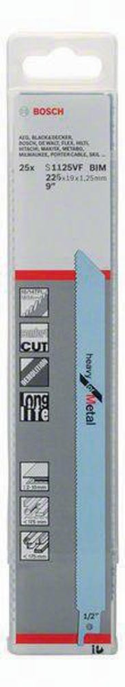 Säbelsägeblatt S 1125 VF. Heavy for Metal. Werkstoff: BIM. Zahnausführung: Varioverzahnt. Einsatzbereiche: Für mittelstarke bis starke Bleche (von 2 bis 10 mm Stärke) · für dünnwandige und dickwandige Rohre und Profile (kleiner als 175 mm Stärke). Ideal für Abbrucharbeiten in Metall. Müheloser · feiner Schnitt. Inhalt der Verkaufsverpackung: 25 Stück.
