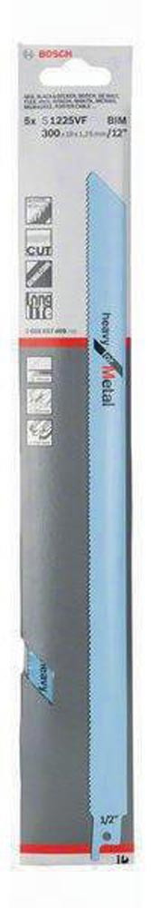 Säbelsägeblatt S 1225 VF Heavy for Metal. Werkstoff: BIM. Zahnausführung: Varioverzahnt. Einsatzbereiche: Für mittelstarke bis starke Bleche (von 2 bis 10 mm Stärke) · dünnwandige und dickwandige Rohre und Profile (kleiner als 250 mm Stärke). Ideal für Abbrucharbeiten in Metall. Müheloser · feiner Schnitt. Inhalt der Verkaufsverpackung: 5 Stück.