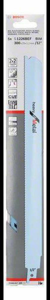 Säbelsägeblatt S 1226 BEF. Heavy for Metal. Werkstoff: BIM. Patentierte 2x2 Tooth Geometry. Einsatzbereiche: Für mittelstarke bis starke Bleche (von 3 bis 8 mm Stärke) · dünnwandige geschlossene und offene Profile und Rohre (kleiner als 250 mm Stärke). Feine · präzise winkelgenaue Schnitte. Inhalt der Verkaufsverpackung: 5 Stück.