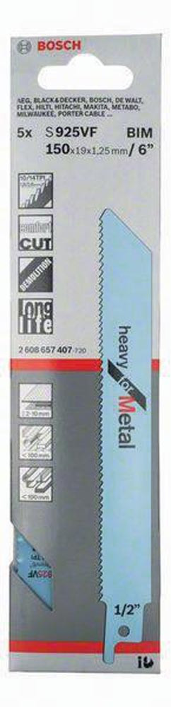 Säbelsägeblatt S 925 VF. Heavy for Metal. Werkstoff: BIM. Zahnausführung: varioverzahnt. Einsatzbereiche: Für mittelstarke bis starke Bleche( von 2 bis 10 mm Stärke) · für dünnwandige und dickwandige Rohre und Profile (kleiner als 100 mm Stärke). Ideal für Abbrucharbeiten in Metall. Müheloser · feiner Schnitt. Inhalt der Verkaufsverpackung: 5 Stück.