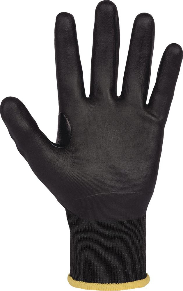 nach EN 388 · EN 407 · EN 16350 · Kat.II · Material: recyceltes Polyester (18 gg) und Stahlfasern · nahtlos gestrickt, Nitril-Mikroschaumbeschichtung und Daumenverstärkung · Schnittschutzlevel A/A1 · antistatisch nach EN 16350 · touchscreenfähig · Kontakthitzelevel 1 · silikonfrei · schwarz mit Farbcodierung · lebensmittelgeeignet · zertifiziert nach Oeko-Tex®