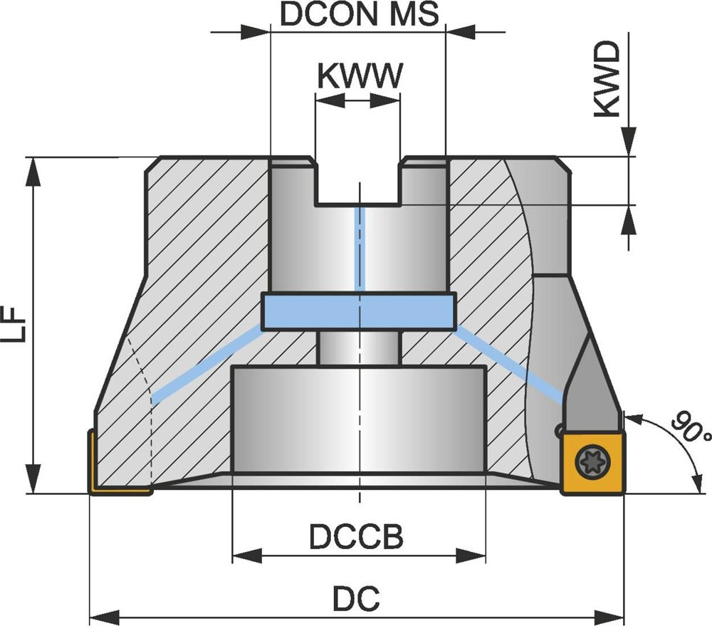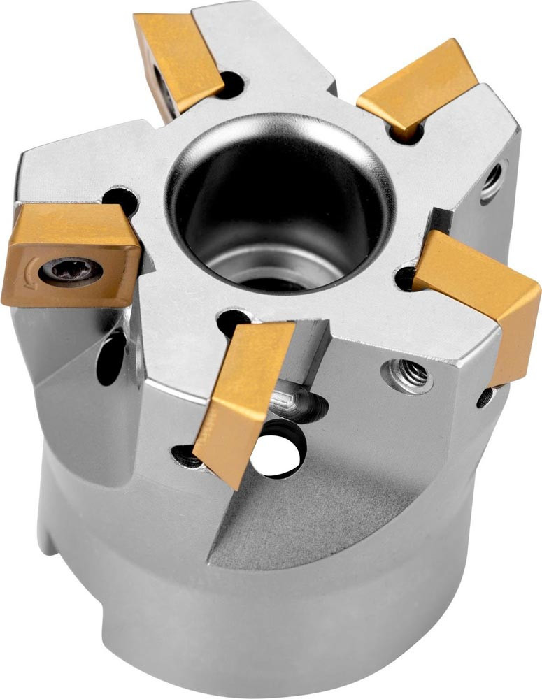 Eckfräser mit positiver/negativer Geometrie zum spannen von 5 Stück SOMT 09T3.. einseitigen Wendeschneidplatten · Schnittdurchmesser 40mm mit 90° Anstellwinkel und 16mm Verbindungsbohrung gemäß DIN 8030-A · 40mm Überstandslänge · Kühlkanalbohrung zum flachen Schulterfräsen · flachen Nutfräsen und Tauchfräsen mit einer maximalen Schnitttiefe von 8.0mm