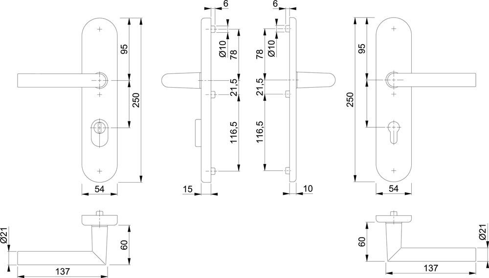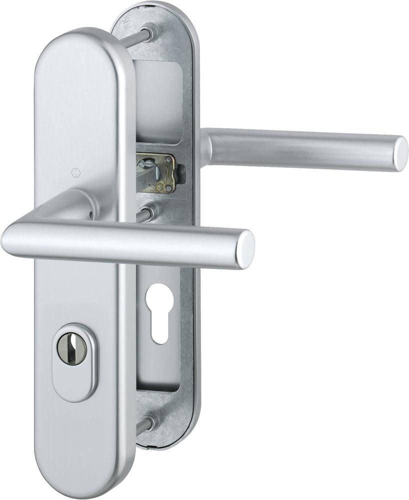 für Abschlusstüren · einbruchhemmend nach DIN 18257 · Stahl-Unterkonstruktion im Außen- und Innenschild · mit Rückholfeder-Paket · mit Zylinderabdeckung aus gehärtetem Stahl für vorstehende Zylinderlänge 10-18 mm · innen: loser Türgriff, mit Schnellstift-Verbindung · hochfeste, verdeckte Verschraubung · Knopfschild-Randhöhe: 15 mm · Lochung PZ · DIN links / rechts · einschließlich Befestigungsmaterial · Widerstandsklasse ES 1