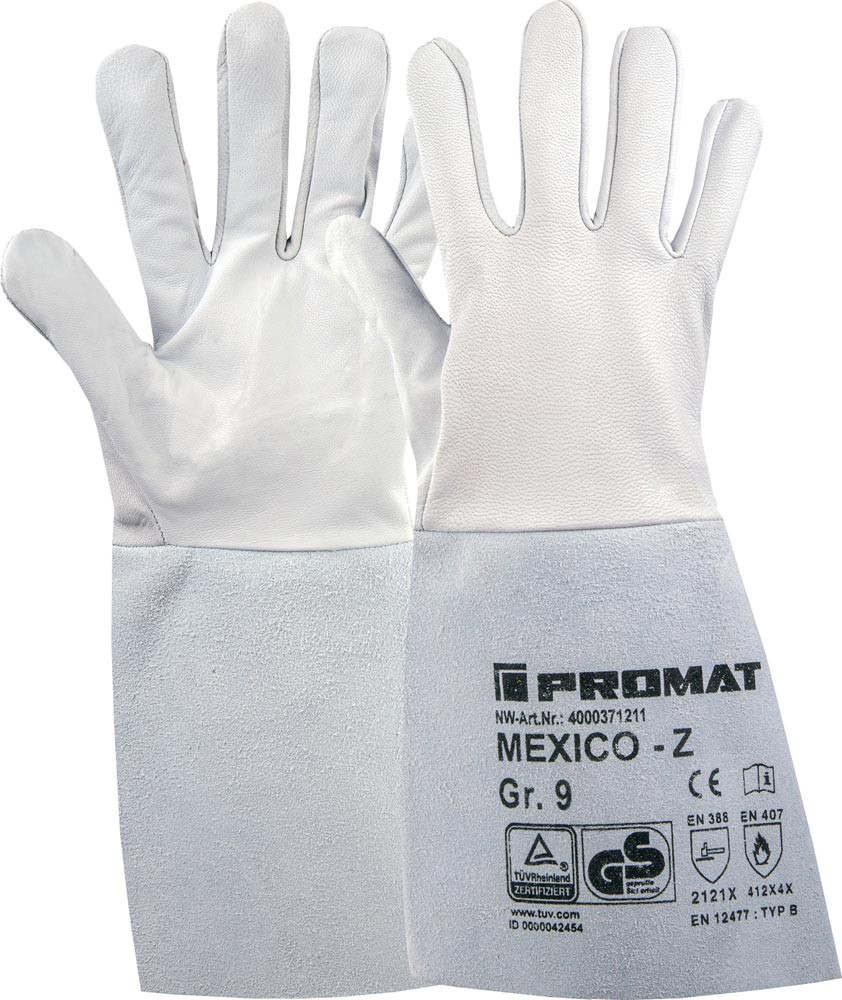 nach EN 388 · EN 407 · EN 12477 Ausführung B · Kat. II · Material: Ziegennappaleder mit Stulpe · mit Flügeldaumen · schadstoffgeprüft · belastbar, mit gutem Tragekomfort · atmungsaktiv · GS (geprüfte Sicherheit) geprüft vom TÜV Rheinland · Anwendung: Wartungsarbeiten, Automobilindustrie, Elektro-, Montage- und Kraftwerkindustrie, Argon- und Elektroschweißen, Montage-Schweißen/-Schneiden, WIG-Schweißen