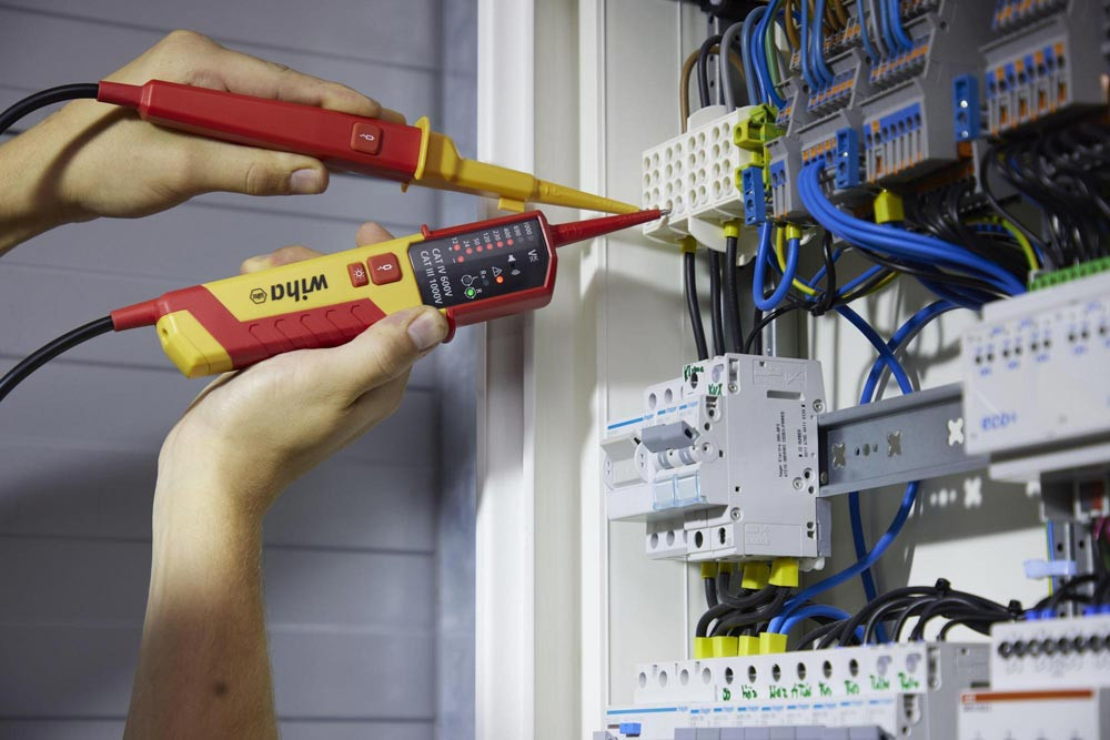 schnelle Einhandprüfung an Netzsteckdosen durch 19 mm Kontaktabstand · integrierte Taschenlampenfunktion sorgt für optimale Lichtverhältnisse. · Überprüfung der FI-Auslösung durch zwei Lasttasten · Spannungsprüfung im komfortablen Messbereich von 12 bis 1.000 V AC bzw. 1.500 V DC · zusätzlich bietet er die Möglichkeit der Durchgangsprüfung der optischen Drehfeldprüfung, der Einpolprüfung sowie der automatischen Polaritätserkennung · Messergebnisse sind dank einer LED-Anzeige einfach ablesbar ·ein zusätzlicher Signalton signalisiert den Stromfluss bei der Durchgangsprüfung · außerdem kann die Prüfung an Steckdosen komfortabel mit Hilfe des integrierten Abstandhalters einhändig durchgeführt werden · gleichzeitiges Drücken der Tasten an beiden Griffen der Prüfspitzen ermöglicht die Funktionsprüfung des FI-Schutzschalters durch das Zuschalten einer Last · gemäß den Messkategorien CAT III bis 1.000 V und CAT IV bis 600 V bietet der Spannungs- und Durchgangsprüfer maximale Sicherheit für Arbeiten im Bereich der Gebäudeinstallation sowie direkt an Quellen der Niederspannungsinstallation. IEC/EN 61243-3:2014 · IP64