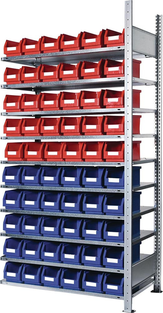 Steckregal H2000xB1000xT300mm Anbauregal 10 Stahlböden 30 x Gr. 5 blau, 30 x Gr. 5 rot