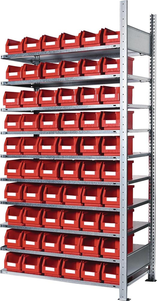 komplett mit Sichtlagerkästen Raster-Plan°· einfache und schnelle Steckmontage mit vormontierten verzinkten Rahmen · Fachböden verzinkt mit verstärktem Kastenprofil, H 25 mm, höhenverstellbar im 25-mm-Raster · Tragfähigkeit pro Fachboden 150 kg · Feldlast 1300 kg
