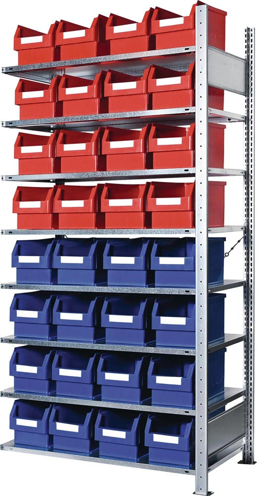 Steckregal H2000xB1000xT400mm Anbauregal 8 Stahlböden 16 x Gr. 3 blau, 16 x Gr. 3 rot