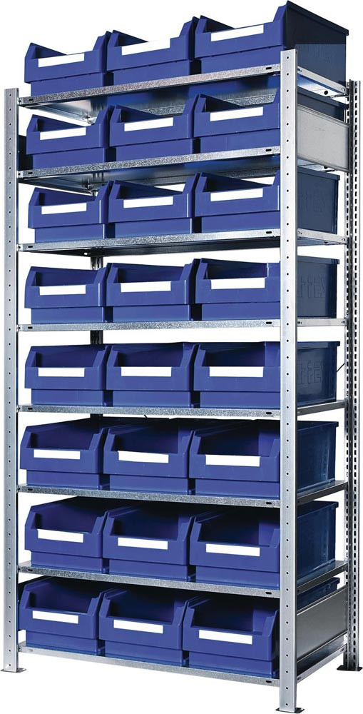 komplett mit Sichtlagerkästen Raster-Plan°· einfache und schnelle Steckmontage mit vormontierten verzinkten Rahmen · Fachböden verzinkt mit verstärktem Kastenprofil, H 25 mm, höhenverstellbar im 25-mm-Raster · Tragfähigkeit pro Fachboden 150 kg · Feldlast 1300 kg
