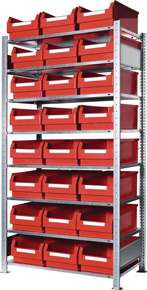 komplett mit Sichtlagerkästen Raster-Plan°· einfache und schnelle Steckmontage mit vormontierten verzinkten Rahmen · Fachböden verzinkt mit verstärktem Kastenprofil, H 25 mm, höhenverstellbar im 25-mm-Raster · Tragfähigkeit pro Fachboden 150 kg · Feldlast 1300 kg