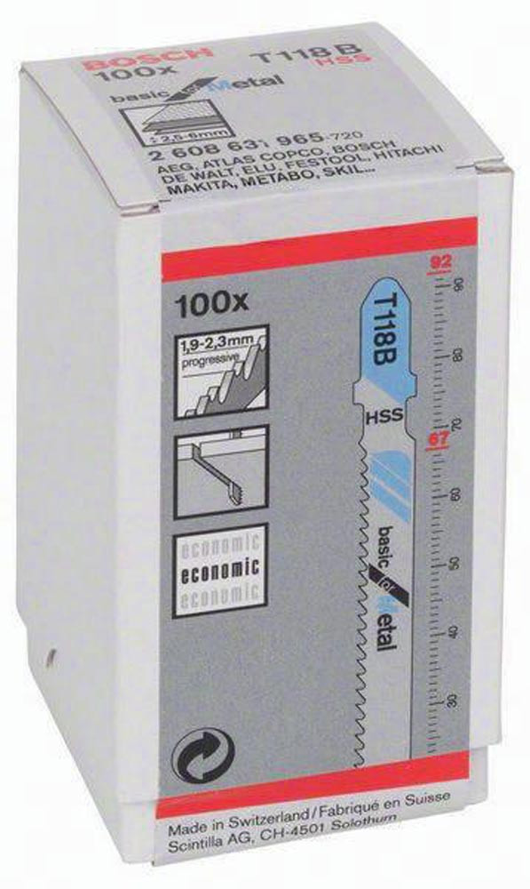 Stichsägeblatt T 118 B Basic for Metal. Das T 118 B Basic for Metal Stichsägeblatt macht gerade Schnitte in Metall. Die gefrästen · gewellten Zähne sind ideal für Schnitte ohne besondere Anforderungen. Das Blatt aus hochwertigem gehärtetem Hochgeschwindigkeitsstahl ist zum Schneiden von nicht perforierten Metallblechen mit Standard-Stärke geeignet. Die feine Zahnteilung des Blatts (1,9-2,3 mm) ermöglicht es · eine Vielzahl an mittelstarken Metallblechen mit einer Dicke von 2,5 bis 6 mm zu schneiden. Für den Gebrauch mit Stichsägen mit T-Schaft-Aufnahme. Einnockenschaft. Gut und günstig. Inhalt der Verkaufspackung: 100 Stück.