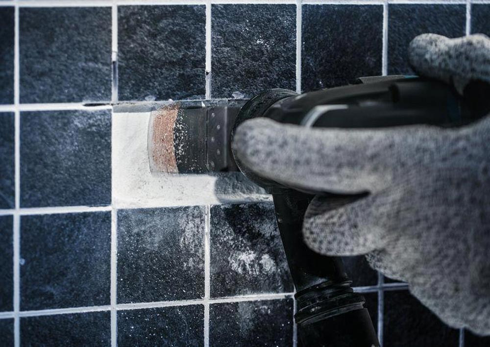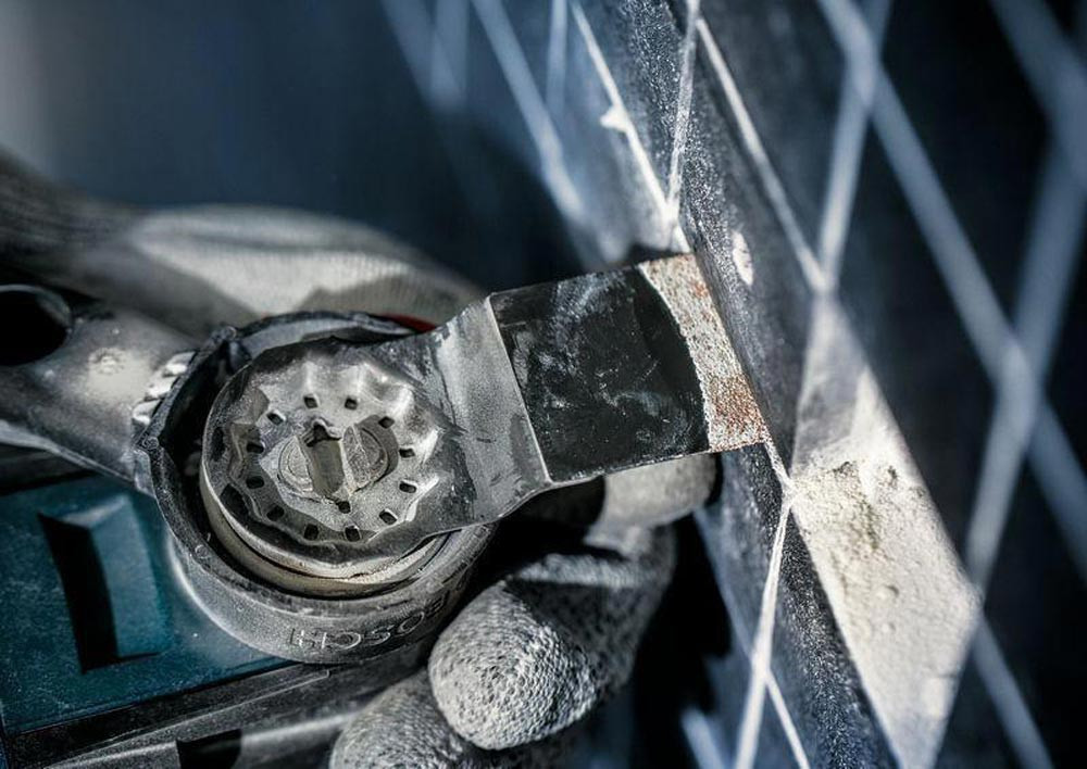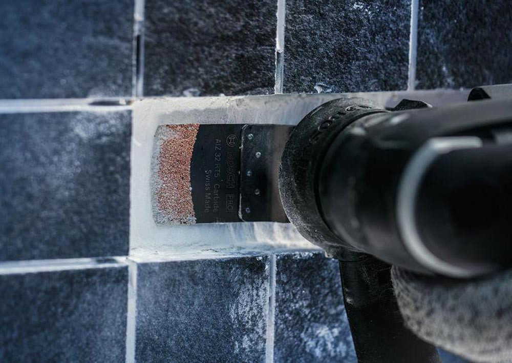 zum Entfernen von Fliesen und abrasive Materialien · duales Design: erledigt die Arbeit von zwei Standardblättern · erreicht die Fugen auch um kleine Fliesen herum und ermöglicht sauberes Abschleifen alten Mörtels · robustes Carbide-Korn
