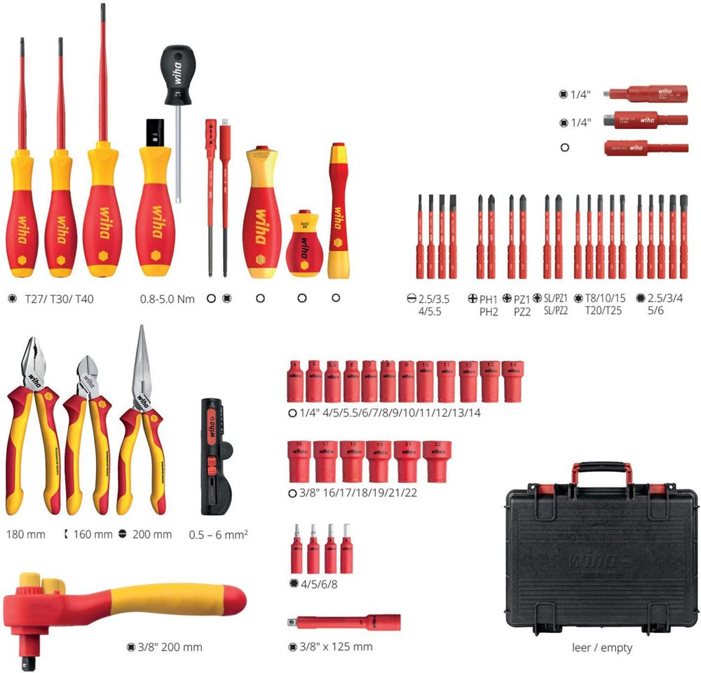 1x Seitenschneider Industrial electric mit DynamicJoint® 160 mm · 6 1/2″ (43336) 1x Kombizange Industrial electric mit DynamicJoint® und OptiGrip mit extra langer Schneide 180 mm · 7″ (33186) 1x Flachrundzange Industrial electric mit Schneide gebogene Form · ca. 40° 200 mm · 8″ (35462) 1x Abisolier-Multitool für Rundkabel 125 mm · 5″ (44242) 1x Schraubendreher SoftFinish® electric slimFix TORX® T27 x 125 mm (36540) 1x Schraubendreher SoftFinish® electric slimFix TORX® T30 x 125 mm (36541) 1x Schraubendreher SoftFinish® electric slimFix TORX® T40 x 150 mm (36542) 1x Ratschenschlüssel isoliert für Steckschlüssel 3/8″ umschaltbar 200 mm (43052) 1x Verlängerung isoliert 3/8″ für Steckschlüsseleinsätze isoliert 125 mm (43057) 1x Vierkant-Adapter isoliert 3/8“ für 1/4″ Steckschlüssel (44355) 1x Schraubendreher mit Bithalter Set SoftFinish® slimVario® electric 4-tlg. mit slimBits auf SB-Karte (43449) 1x Feinschraubendreher Set PicoFinish® slimVario® electric 4-tlg. mit slimBits (43167) 1x Schraubendreher mit Bithalter SoftFinish® electric slimVario Stubby für slimBits 6,0 mm (41229) 1x Verlängerung slimVario® electric für slimBits 6,0 mm x 69,5 mm (43292) 1x Adapter slimVario® electric für 1/4″ Steckschlüssel 59 mm (43139) 1x Drehmoment-Schraubendreher TorqueVario®-S electric variabel einstellbare Drehmomentbegrenzung 0.8 - 5 (26626) 1x Adapter TorqueVario-S electric für 1/4″ Steckschlüssel (43128) 1x Bit slimBit electric Schlitz 2,5 mm x 75 mm (34578) 1x Bit slimBit electric Schlitz mit Zapfen 3,5 mm x 75 mm (44385) 1x Bit slimBit electric Schlitz 4,0 mm x 75 mm (34580) 1x Bit slimBit electric Schlitz 5,5 mm x 75 mm (34581) 1x Bit slimBit electric Phillips PH1 x 75 mm (34583) 1x Bit slimBit electric Phillips PH2 x 75 mm (34584) 1x Bit slimBit electric Pozidriv PZ1 x 75 mm (34585) 1x Bit slimBit electric Pozidriv PZ2 x 75 mm (34586) 1x Bit slimBit electric PlusMinus/Pozidriv SL/PZ1 x 75 mm (34589) 1x Bit slimBit electric PlusMinus/Pozidriv SL/PZ2 x 75 mm (34590) 1x Bit slimBit electric TORX® T8 x 75 mm (35506) 1x Bit slimBit electric TORX® T10 x 75 mm (35507) 1x Bit slimBit electric TORX® T15 x 75 mm (35508) 1x Bit slimBit electric TORX® T20 x 75 mm (35509) 1x Bit slimBit electric TORX® T25 x 75 mm (36071) 1x Bit slimBit electric Sechskant 2,5 mm x 75 mm (37224) 1x Bit slimBit electric Sechskant 3,0 mm x 75 mm (37147) 1x Bit slimBit electric Sechskant 4,0 mm x 75 mm (37225) 1x Bit slimBit electric Sechskant 5,0 mm x 75 mm (37226) 1x Bit slimBit electric Sechskant 6,0 mm x 75 mm (37227) 1x Steckschlüsseleinsatz isoliert 1/4″ Außensechskant 4,0 mm x 42 mm (43088) 1x Steckschlüsseleinsatz isoliert 1/4″ Außensechskant 5,0 mm x 42 mm (43089) 1x Steckschlüsseleinsatz isoliert 1/4″ Außensechskant 5,5 mm x 42 mm (10102) 1x Steckschlüsseleinsatz isoliert 1/4″ Außensechskant 6,0 mm x 42 mm (43091) 1x Steckschlüsseleinsatz isoliert 1/4″ Außensechskant 7,0 mm x 42 mm (10103) 1x Steckschlüsseleinsatz isoliert 1/4″ Außensechskant 8,0 mm x 42 mm (43093) 1x Steckschlüsseleinsatz isoliert 1/4″ Außensechskant 9,0 mm x 42 mm (10104) 1x Steckschlüsseleinsatz isoliert 1/4″ Außensechskant 10,0 mm x 42 mm (43095) 1x Steckschlüsseleinsatz isoliert 1/4″ Außensechskant 11,0 mm x 42 mm (43096) 1x Steckschlüsseleinsatz isoliert 1/4″ Außensechskant 12,0 mm x 42 mm (10105) 1x Steckschlüsseleinsatz isoliert 1/4″ Außensechskant 13,0 mm x 42 mm (43098) 1x Steckschlüsseleinsatz isoliert 1/4″ Außensechskant 14,0 mm x 42 mm (43099) 1x Steckschlüsseleinsatz isoliert 3/8″ Außensechskant 16,0 mm x 45 mm (43071) 1x Steckschlüsseleinsatz isoliert 3/8″ Außensechskant 17,0 mm x 45 mm (43072) 1x Steckschlüsseleinsatz isoliert 3/8″ Außensechskant 18,0 mm x 45 mm (43073) 1x Steckschlüsseleinsatz isoliert 3/8″ Außensechskant 19,0 mm x 47 mm (43074) 1x Steckschlüsseleinsatz isoliert 3/8″ Außensechskant 21,0 mm x 47 mm (43075) 1x Steckschlüsseleinsatz isoliert 3/8″ Außensechskant 22,0 mm x 47 mm (43076) 1x Steckschlüsseleinsatz isoliert 1/4″ Innensechskant 4,0 mm x 65 mm (43110) 1x Steckschlüsseleinsatz isoliert 1/4″ Innensechskant 5,0 mm x 65 mm (43111) 1x Steckschlüsseleinsatz isoliert 1/4″ Innensechskant 6,0 mm x 65 mm (43112) 1x Steckschlüsseleinsatz isoliert 1/4″ Innensechskant 8,0 mm x 65 mm (43113) 1x Koffer