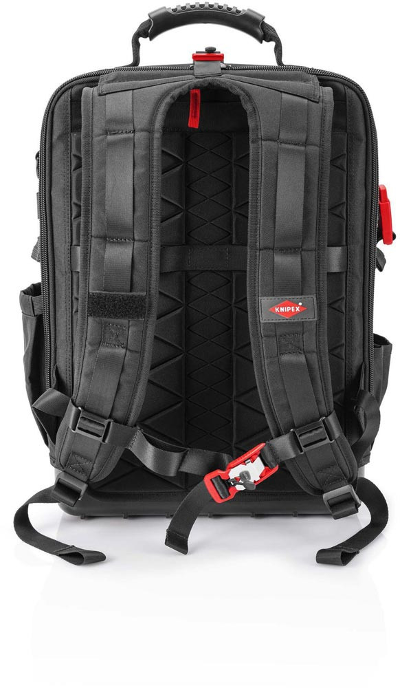mit 16 KNIPEX-Werkzeugen - insgesamt 22 Markenwerkzeugen · teilweise VDE-geprüft nach DIN EN 60900 · komplett aufklappbare Vorder- und Rückseite, herausnehmbare Werkzeugtafel und ergonomische Rückenpolsterung · innovative FIDLOCK®-Adapter und MOLLE-Bänder · 2 separaten Innenfächern für Werkzeug, Messgeräte, Notebook oder Tablet · max. Zuladung: 15 kg · 18 l Fassungsvermögen · widerstandsfähiges Gewebe aus nachhaltigen Recycling-Kunstfasern: spritzwassergeschützt und leicht zu reinigen · wasserdichte Bodenschale aus schlagfestem Kunststoff für stabilen Stand im geöffneten und geschlossenen Zustand, 6 cm hoch · innen 1 und außen 4 MOLLE-Bänder zur Befestigung von beliebigen Adaptern, Karabinern, Zubehör je nach Bedarf · schnelle FIDLOCK®-Verbindungen sind im Handumdrehen befestigt oder gelöst · mit insgesamt 21 Haltelaschen und 37 Taschen, teilweise mit Reißverschlüssen · mit Kofferlasche zur Fixierung an Teleskopgriffen von Werkzeugkoffern (H x B x T: 53 x 34 x 21 cm) · Leergewicht 2,9 kg · geprüfte Belastbarkeit bis 15 kg Werkzeuggewicht - Abmessung Breite außen (innen): 340mm - Abmessung Höhe außen (innen): 210mm - Abmessung Tiefe außen (innen): 530mm