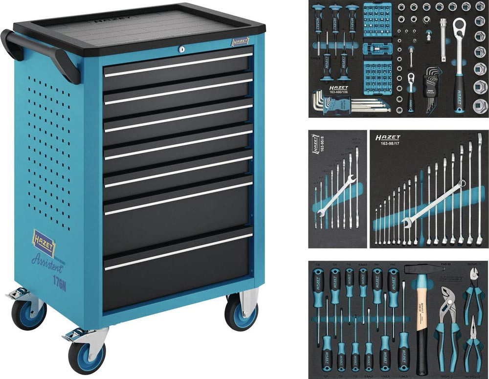 Anwendung: Effiziente · mobile Organisation von Werkzeug. Werkzeug- · Material- und Montagewagen. 5 flache und 2 hohe Schubladen. Komplett mit 147-teiligem Werkzeug Sortiment in Safety-Insert-System Weichschaumeinlage. Hohe Flexibilität. Griff und Rollen wahlweise links oder rechts montierbar. Praktisches HAZET Design. Griffleisten für angenehme Haptik. Kunststoffhaube mit Texturen und großer vertiefter · komplett nutzbarer Arbeitsfläche. Komplett abgedichtete Arbeitsfläche schützt Wageninneres bei auslaufenden Flüssigkeiten. Abgeschrägte Kanten vermeiden Beschädigungen. Zahlreiche Befestigungsmöglichkeiten. Zubehör · wie z. B. HAZET Papierkorb · Dosenhalter an linker und rechter Seite montierbar. Rückwärtige Schraubpunkt zur Montage von weiterem Zubehör. Arbeitsflächen. Deutlich vergrößerte Ablage- und Arbeitsfläche in Kunststoff. Modernes Oberflächendesign der Arbeitsfläche. Lösemittelbeständige Arbeitsfläche schützt Wageninneres bei auslaufenden Flüssigkeiten. Umrandung der Arbeitsfläche schützt Teile vor Herabfallen. Korpus / Fahrgriff. Extrem robuste Ausführung durch doppelwandige Konstruktion. Komplette Schweißkonstruktion des ganzen Korpus für den täglichen harten Werkstatteinsatz. Individuelle Befestigungsmöglichkeiten durch Quadrat-Lochraster auf Seitenwänden · z. B. für HAZET Hakenprogramm Artikelgruppe 112 für Werkzeuge oder andere Anbauteile wie z. B. Dosenhalter · Papierrollenhalter · Papierkorb · etc.. Stabiler Fahrgriff beidseitig fest am Korpus montierbar. Verriegelungs-Konzept. 2-stufige VerriegelungZentralverriegelung · abschließbar durch Zylinderschloss mit 2 Knickschlüsseln. Gegenseitige Auszugssperre für minimales Kipprisiko. Schubladen-Konzept. Gegenseitige Verriegelung der Schubladen verhindert ungewolltes Öffnen. 100 % Auszug mit Rollenführungen. Schubladendesign zur optimalen Nutzung des Innenraums. Schubladenfronten für optimiertes Handling. Schmutzunempfindliche Schubladen-Beschichtung zur einfachen Reinigung. Hochleistungs-Fahrwerk. Große stark belastbare Räder mit Präzisionskugellager und zweifachem Kugelkranz im Schwenklager · einfaches Bewegen auch bei hoher dynamischer Last. 2 Lenkrollen mit Doppelstopp: Gebremste Rollen verhindern Wegrollen. Gebremste Schwenklager verhindern Drehen der Lenkrollen · z. B. auf schrägen Flächen. Schutzring verhindert Eindringen von Schmutz und Fäden. Elastikrollen ermöglichen ruhigen Lauf. Gesamttragkraft (dynamisch): 480 kg. Gesamttragkraft (statisch): 480 kg. Traglast hohe Schublade: 20 kg. Farbe: HAZET blau. Maße: 780 mm x 498 mm x 1018 mm. (Schubladen)größe für Ordnungssystem: 3/3. Höhe Arbeitsfläche: 1002 mm. Anzahl Bockrollen: 2 (∅ 125 mm). Anzahl Lenkrollen: 2 (∅ 125 mm). Anzahl Werkzeuge: 147.