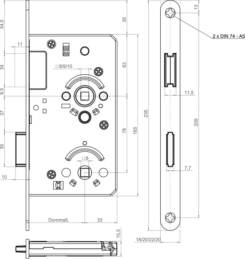 WC Ausführung · Einsteckschloss mit Magnetfalle · Falle ist bei geöffneter Tür bündig mit Stulp · im geschlossenen Zustand der Tür fällt die Falle durch einen Magneten ins Schließblech · geräuscharme Schließung · Klemmnuss aus Stahl, verzinkt · Nusslager aus Polyamid · Falle aus Kunststoff, schwarz · Riegel 2-tourig aus Stahl · Riegelkopf aus Guss vernickelt · Im Lieferumfang je nach Stulpbreite enthalten: